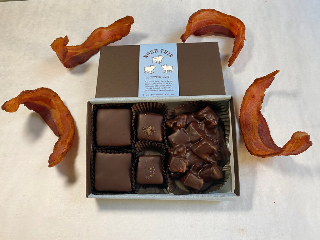 At Nosh This we believe that bacon should be it’s own food group. This box contains two pieces of our signature Bacon Crack, two pieces of Bacon Salted Caramel and one piece of our Bourbon Bacon Rocky Road made with Maker's Mark Marshmallows (Maker's Mar-shmallows? Maker'smallows?)