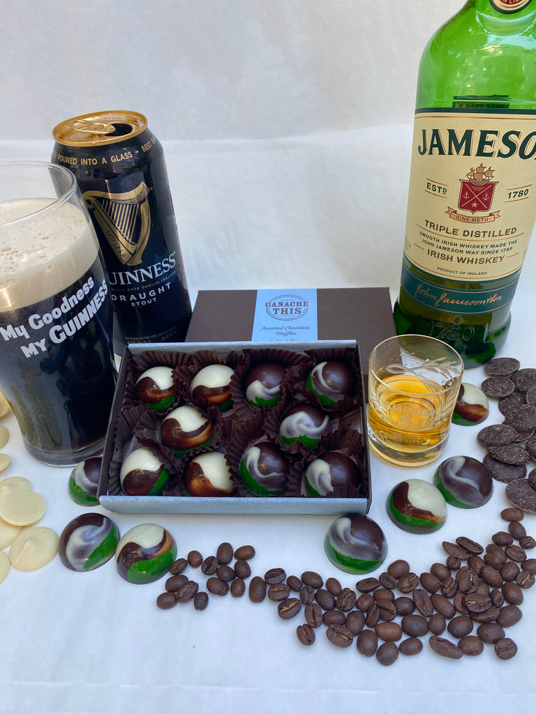 This is a duet of boozy, St. Patrick's Day-inspired truffles, which I believe even my tee-totaling, Irish grandmother would have appreciated. You'll get five dark chocolate ganache Guinness Stout truffles in a white chocolate shell, and five white chocolate ganache Irish Coffee truffles encased in a 72% dark chocolate shell.